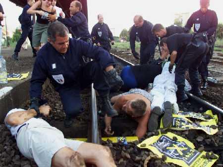 Rapidement repérés par l'hélicoptère de la gendarmerie qui escortait le train, les militants ont juste eu le temps de mettre en oeuvre les techniques de désobéissance civile non-violente acquises deux mois plus tôt au cours d'un stage et de déplier quelques banderoles affirmant "Non au tourisme nucléaire !".